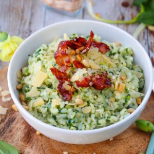 Pendant la cuisson du risotto, mixer les feuilles d'épinards et d'ail des ours ensemble. Faire également griller quelques tranches de bacon dans une poêle (non huilée).