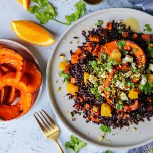Préparer le reste des ingrédients : éplucher et couper l'orange en petits morceaux. Couper la fêta en petits cubes, puis concasser les pistaches. Ciseler la coriandre et réserver le tout.