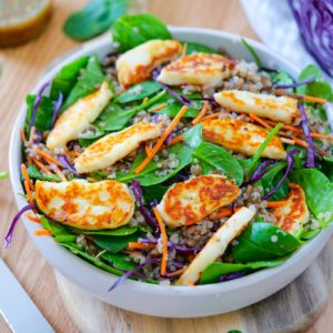 Ajouter le halloumi grillé à la salade avec la vinaigrette avant de déguster :)