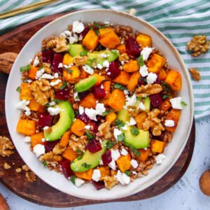 Pendant la cuisson de l’épeautre et de la patate douce, couper la betterave rouge et la pomme en cubes, tailler l’avocat et l’arroser de jus de citron, puis émietter la fêta.
