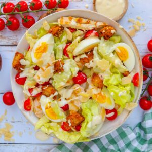 Assembler la salade en disposant dans chaque assiette un peu de cœur de laitue, le poulet coupé en tranches, quelques tomates cerises, des croûtons, du parmesan râpé et la sauce César.
