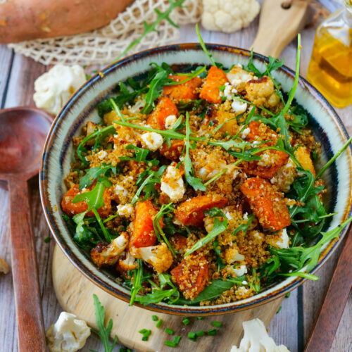 Dans un grand saladier, déposer la roquette, la feta coupée en morceaux, la ciboulette ciselée ainsi que les légumes rôtis et le quinoa croustillant.