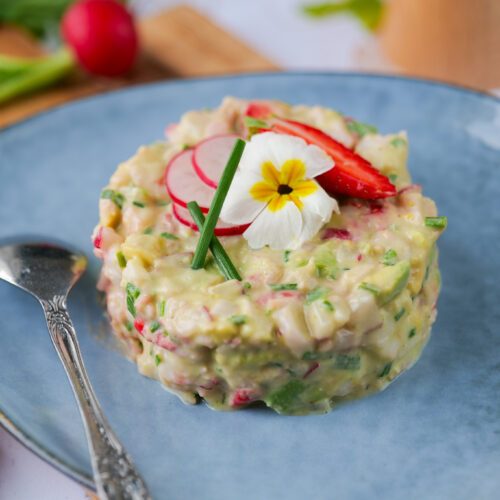 Dresser au dernier moment dans des petites assiettes à l'aide d'un emporte-pièce et décorer avec quelques rondelles de radis et morceaux de fraises.