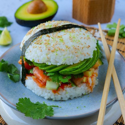 Une fois que le riz sera bien froid, le démouler du bol et le couper en deux, comme un pain hamburger.