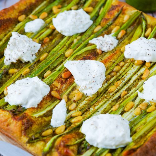 À la fin de la cuisson, déposer de la burrata sur la tarte et la poivrer. Déguster tiède ou froid avec une bonne salade ou une omelette par exemple.