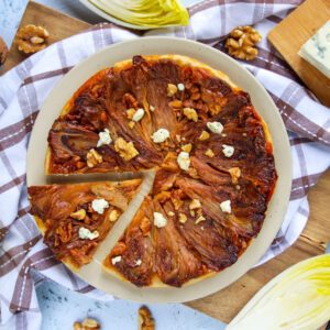 Placer une feuille de papier cuisson au fond d’un moule à charnière. Déposer des morceaux de noix concassées puis recouvrir des endives cuites, faces coupées vers le fond du moule.