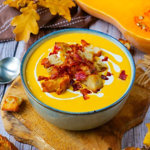 Servir le velouté avec les croutons et le bacon grillé émietté ! Conservation : au réfrigérateur pendant 4 jours.