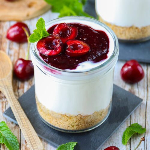 Emietter les biscuits à l'avoine puis les placer au fond de pot en verre. Au moment de servir, ajouter le yaourt nature et verser le coulis de cerises. Ajouter une feuille de menthe et déguster :)